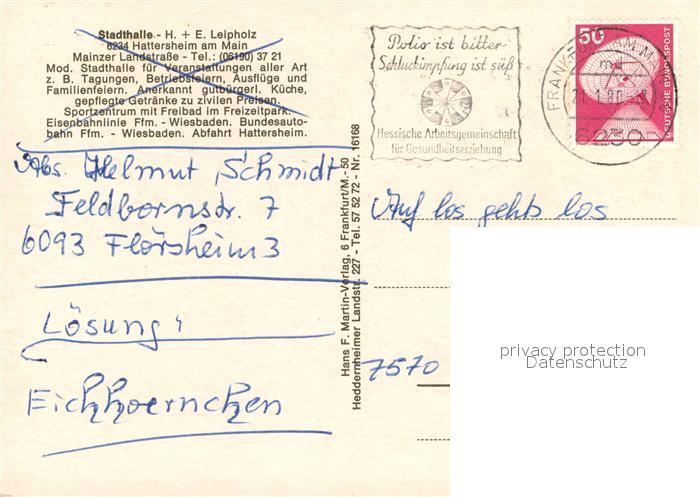 73642980 alte Postkarte Hattersheim Main Stadthalle Springbrunnen Foyer Saal Restaurant Bundeskegelbahn Kueche postalisch gelaufen Erhaltung siehe scans [FriedD77] KatCode: 11110006436005