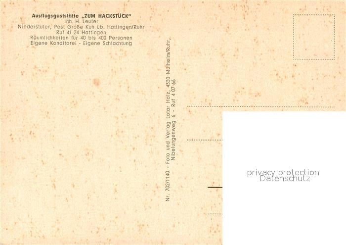 73086760 Hattingen Ruhr Ausflugsgaststaette Zum Hackstueck postalisch nicht gelaufen Erhaltung siehe scans [NatalD47] KatCode: 11110005954016