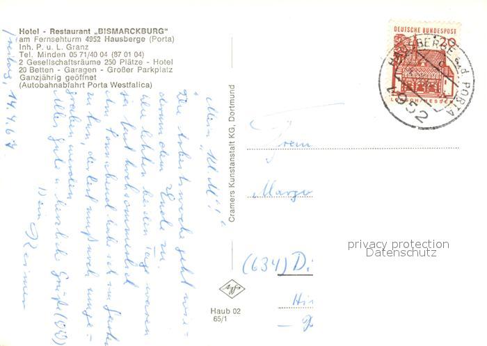 73105073 alte Postkarte Hausberge Hotel Restaurant Bismarckburg postalisch gelaufen Erhaltung siehe scans [KathaD81] KatCode: 11110005770032