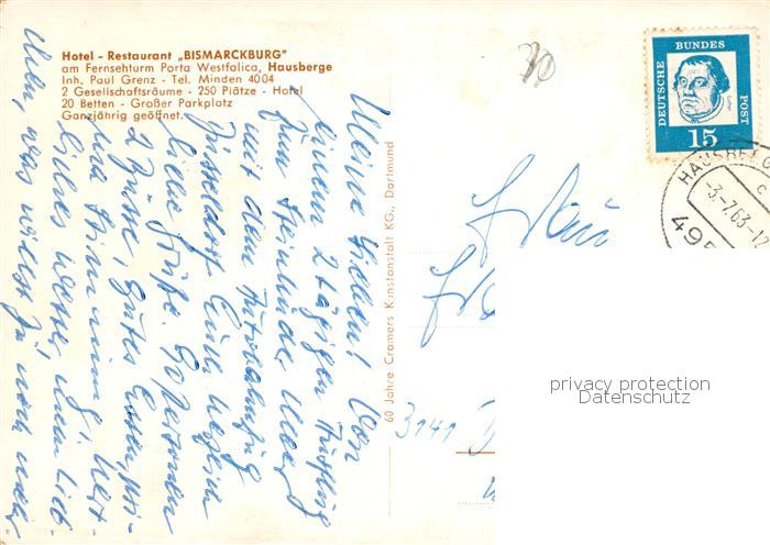 73833484 alte Postkarte Hausberge Porta Westfalica Hotel Restaurant Bismarckring Terrasse Speisesaal Hotelzimmer postalisch gelaufen Erhaltung siehe scans [WerneD78] KatCode: 11110005770032
