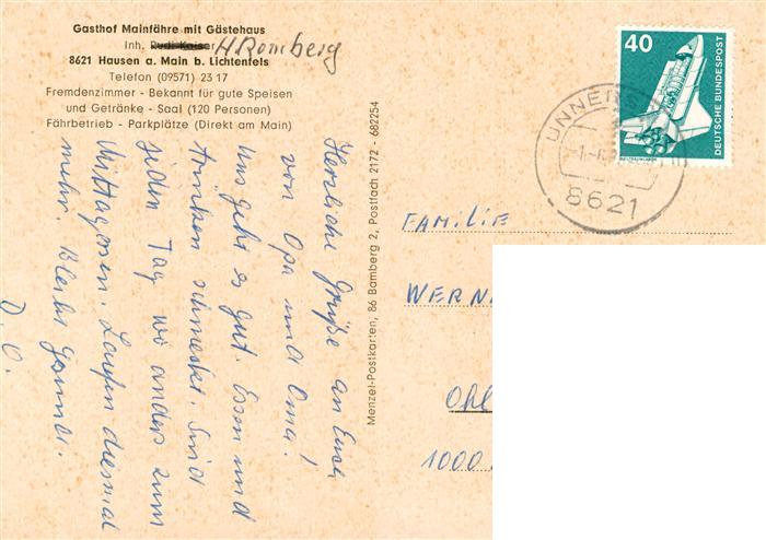 73881877 Hausen Main Gasthof Mainfaehre mit Gaestehaus und Wegweiser postalisch gelaufen Erhaltung siehe scans [WerneD78] alte Postkarte Wern Katcode 11110009478127