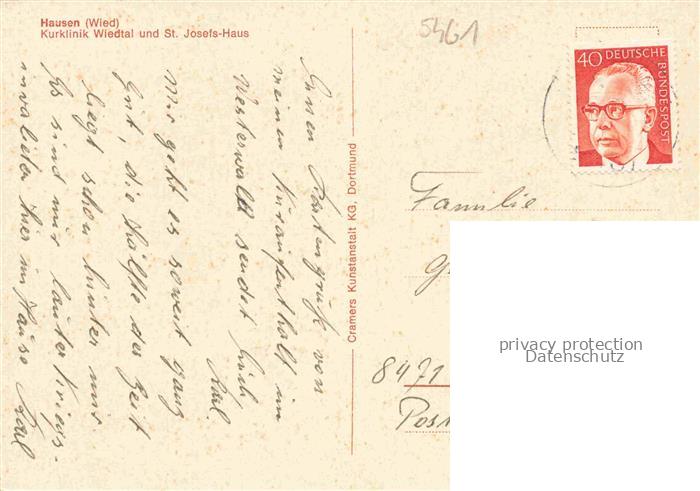 74050243 alte Postkarte Hausen Wied Panorama Kurklinik Wiedtal und St Josefshaus postalisch gelaufen Erhaltung siehe scans [WerneD78] KatCode: 11110007138007