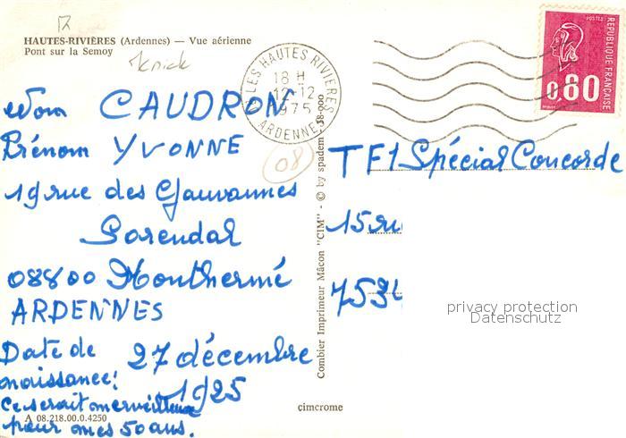13089267 carte postale Hautes-Rivieres Les Fliegeraufnahme Pont sur la Semoy postalisch gelaufen Erhaltung siehe scans [NatalD47] KatCode: 11170008108218