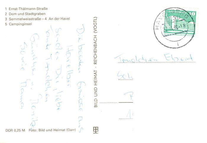 73924234 alte Postkarte Havelberg Ernst Thaelmann Strasse Dom und Stadtgraben Semmelweiss Strasse An der Havel Campinginsel postalisch gelaufen Erhaltung siehe scans [FriedD77] KatCode: 11110015090225