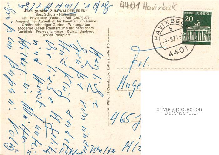 73870158 alte Postkarte Havixbeck Ausflugslokal Zum Waldfrieden Gastraeume Terrasse Damwildgehege Muehle postalisch gelaufen Erhaltung siehe scans [WerneD78] KatCode: 11110005558020