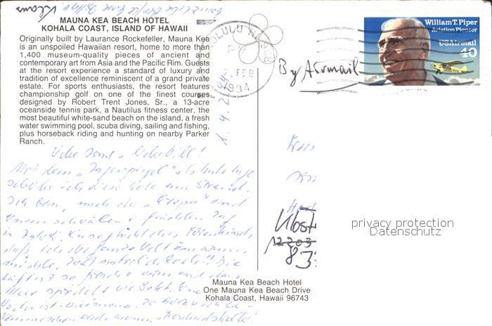 72921212 old postcard Hawaii US-State Mauna Kea Beach Hotel postalisch gelaufen Erhaltung siehe scans [LiesaD40] KatCode: 14140130000000