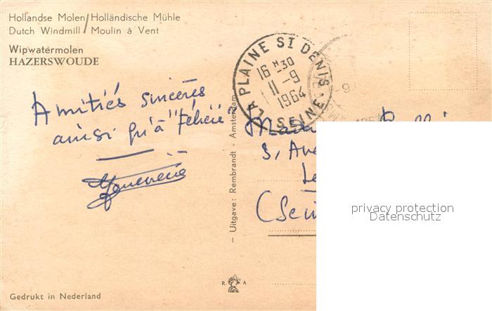 old postcard Hazerswoude Hollandse Molen Windmuehlen Wasserstrasse postalisch gelaufen Erhaltung siehe scans [FriedD77]