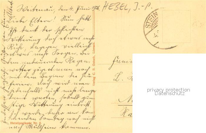 73752832 alte Postkarte Hebel Johann Peter Haus und Derene Nr.8 postalisch gelaufen Erhaltung siehe scans [IrynaD87] KatCode: 11110008336036