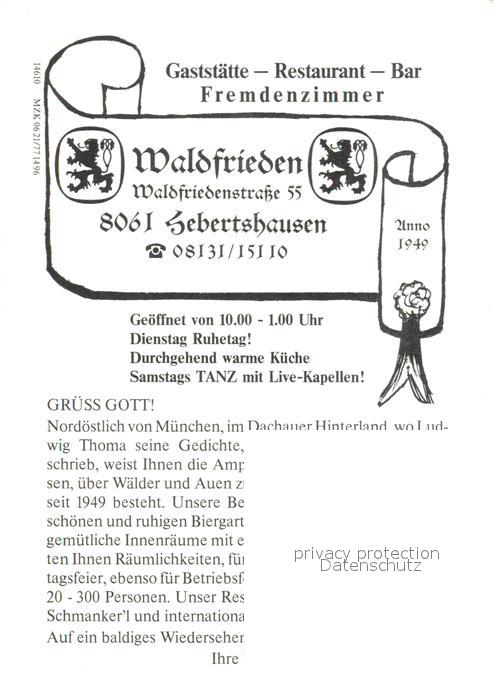 73650089 Hebertshausen Gaststaette Waldfrieden Restaurant Terrasse postalisch nicht gelaufen Werbekarte (keine Postkarte) Erhaltung siehe scans [WerneD78] KatCode: 11110009174122