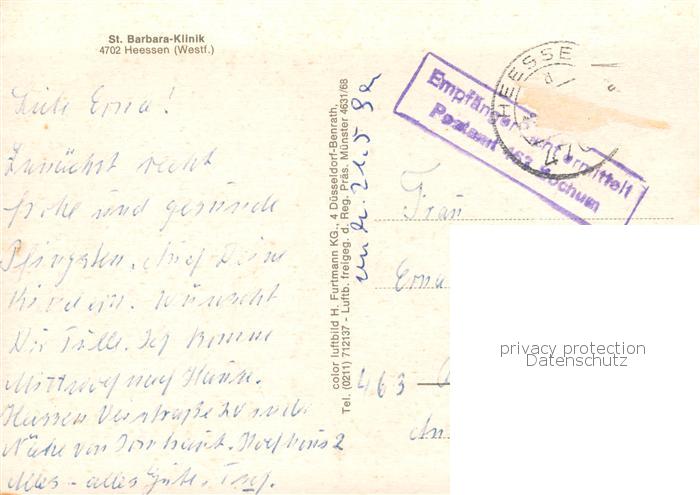 73814303 alte Postkarte Heessen Hamm St Barbara Klinik Fliegeraufnahme postalisch gelaufen Erhaltung siehe scans [FriedD77] KatCode: 11110005915000