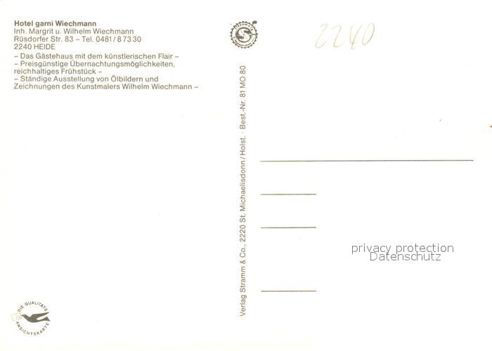 73086235 Heide Holstein Hotel Garni Wiechmann postalisch nicht gelaufen Erhaltung siehe scans [KathaD81] KatCode: 11110001051044