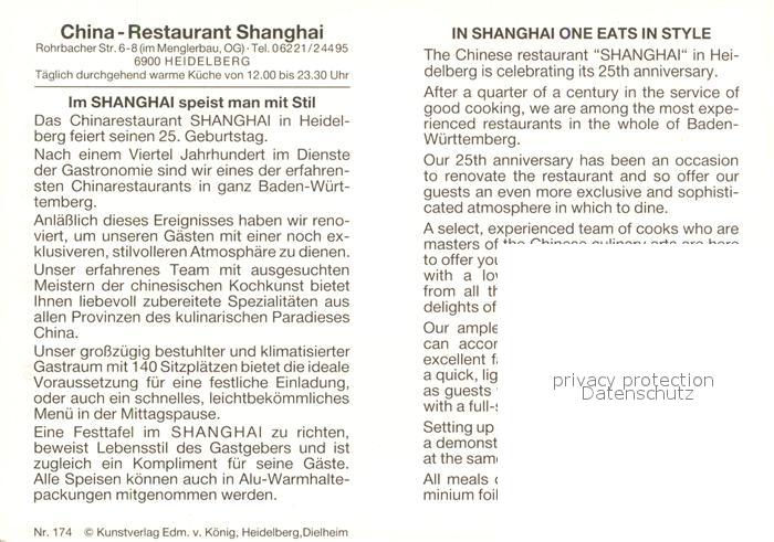 73574362 Heidelberg Neckar China Restaurant Shanghai postalisch nicht gelaufen Werbekarte (keine Postkarte) Erhaltung siehe scans [FriedD77] KatCode: 11110008221000