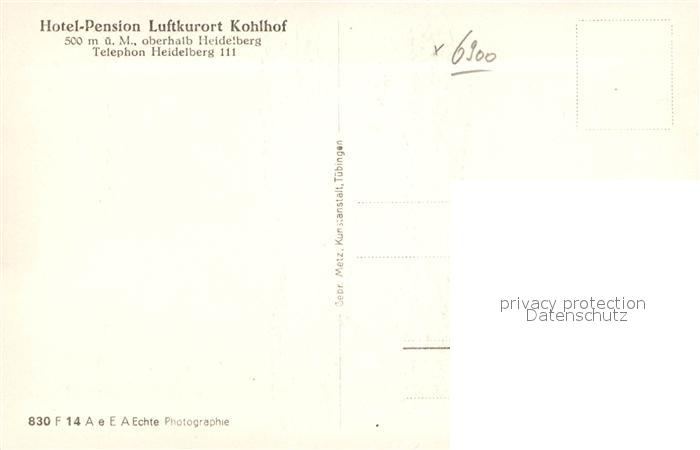 42969957 Heidelberg Neckar Hotel Pension Kohlhof postalisch nicht gelaufen Erhaltung siehe scans [AndreD76] KatCode: 11110008221000