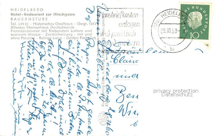 73644123 alte Postkarte Heidelberg Neckar Hotel Restaurant zur Hirschgasse Bauernstube postalisch gelaufen Erhaltung siehe scans [FriedD77] KatCode: 11110008221000