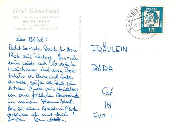 73924537 alte Postkarte Heidelberg Neckar Hotel Schnookeloch Gastraeume Neckarbruecke postalisch gelaufen Erhaltung siehe scans [WerneD78] KatCode: 11110008221000