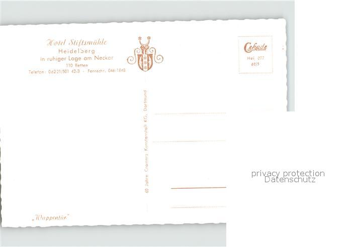 71850558 Heidelberg Neckar Hotel Stiftsmuehle Wappentuer postalisch nicht gelaufen Erhaltung siehe scans KatCode: 11110008221000
