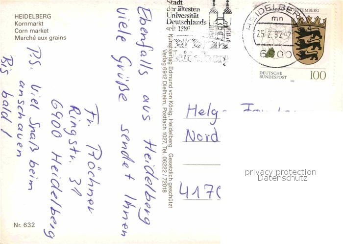 72694541 alte Postkarte Heidelberg Neckar Kornmarkt Brunnen Mariensaeule Burgruine postalisch gelaufen Erhaltung siehe scans [FriedD77] KatCode: 11110008221000