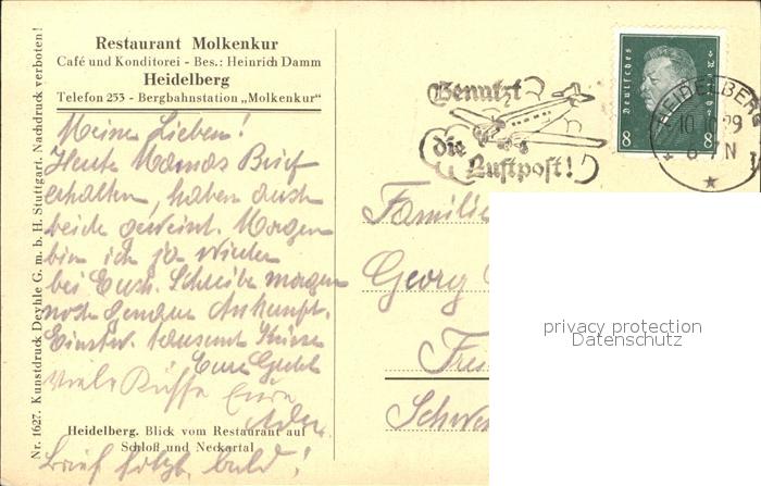 71683625 alte Postkarte Heidelberg Neckar Restaurant Molkenkur Speisesaal postalisch gelaufen Erhaltung siehe scans KatCode: 11110008221000
