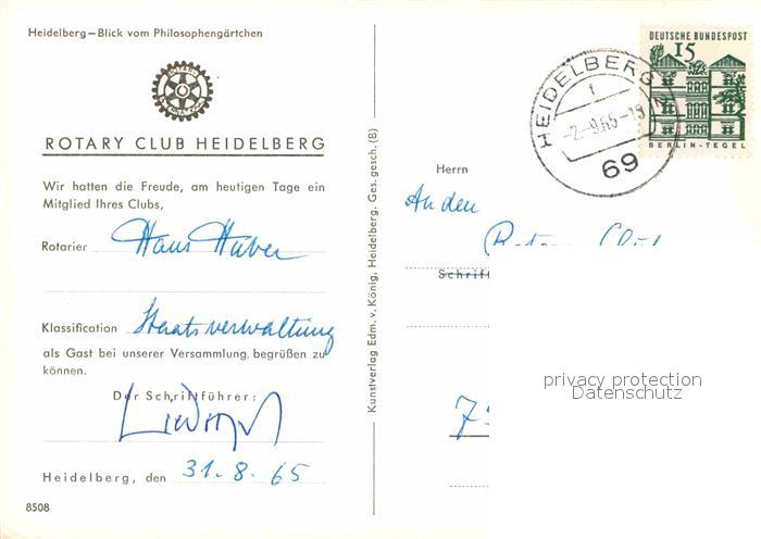 72694125 alte Postkarte Heidelberg Neckar Stadtbild mit Schloss Blick vom Philosophengaertchen Rotary Club postalisch gelaufen Erhaltung siehe scans [FriedD77] KatCode: 11110008221000