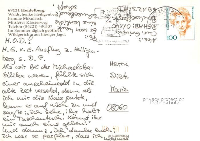 72971490 alte Postkarte Heidelberg Neckar Waldschenke Heiligenberg Aussichtsturm Thingstaette Michaelsbasilika postalisch gelaufen Erhaltung siehe scans [FriedD77] KatCode: 11110008221000