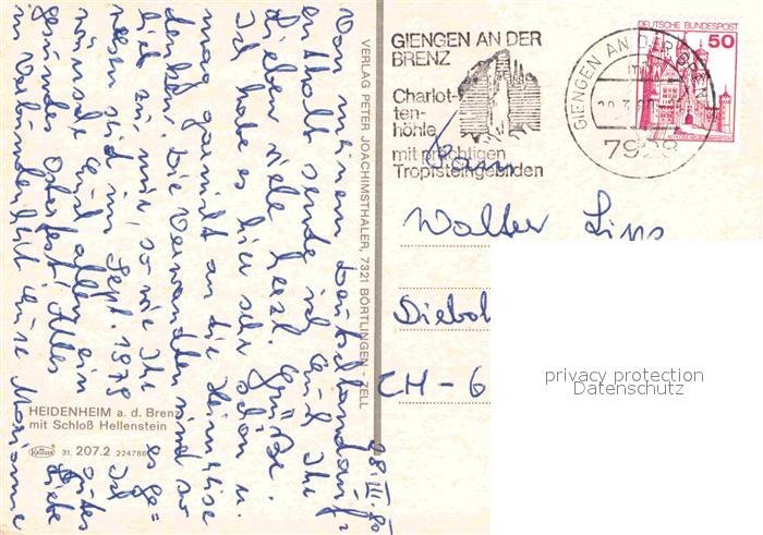 72765506 alte Postkarte Heidenheim Brenz mit Schloss Hellenstein postalisch gelaufen Erhaltung siehe scans [LiesaD40] KatCode: 11110008135019