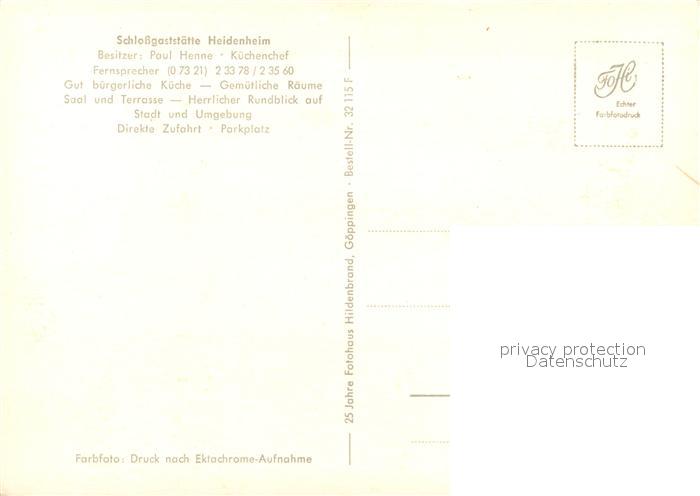 73267508 Heidenheim Brenz Schloss Gaststaette postalisch nicht gelaufen Erhaltung siehe scans [WerneD78] KatCode: 11110008135019