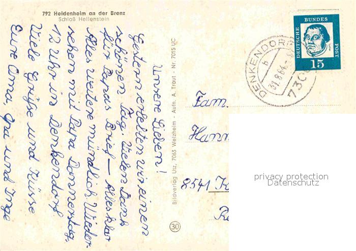 72724125 alte Postkarte Heidenheim Brenz Schloss Hellenstein postalisch gelaufen Erhaltung siehe scans [FriedD77] KatCode: 11110008135019
