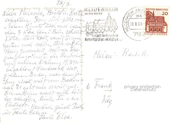 73267503 alte Postkarte Heidenheim Brenz Schloss Hellenstein postalisch gelaufen Erhaltung siehe scans [WerneD78] KatCode: 11110008135019