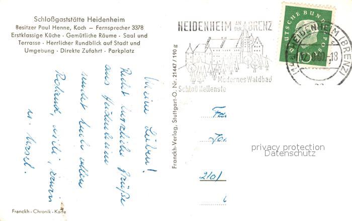 73271895 alte Postkarte Heidenheim Brenz Schloss Hellenstein mit Schlossgaststaette Franckh Chronik Karte postalisch gelaufen Erhaltung siehe scans [FriedD77] KatCode: 11110008135019