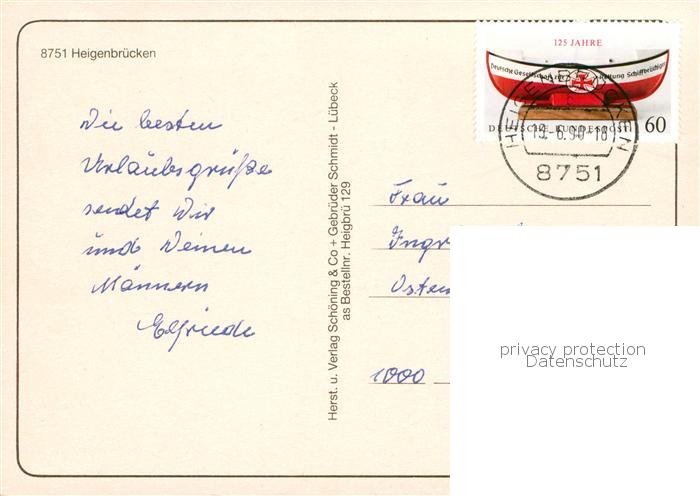 73839507 alte Postkarte Heigenbruecken Panorama Koehlermahlzeit Pollasch Denkmal kath Kirche Schach im Kurpark Muehle in Jakobsthal Kirchplatz Wildpark postalisch gelaufen Erhaltung siehe scans [FriedD77] KatCode: 11110009671126
