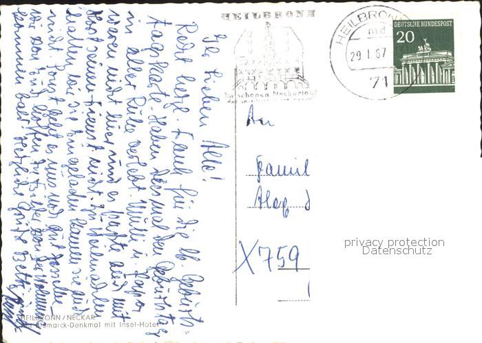 71998565 alte Postkarte Heilbronn Neckar Bismarck Denkmal Insel Hotel postalisch gelaufen Erhaltung siehe scans KatCode: 11110008121000