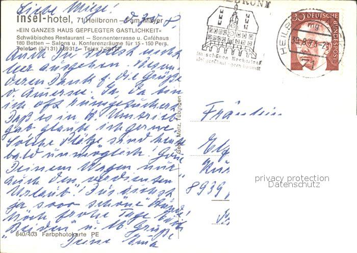72072040 alte Postkarte Heilbronn Neckar Insel Hotel postalisch gelaufen Erhaltung siehe scans KatCode: 11110008121000