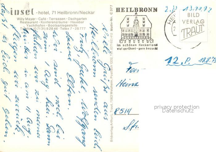 73707696 alte Postkarte Heilbronn Neckar Insel Hotel postalisch gelaufen Erhaltung siehe scans [WerneD78] KatCode: 11110008121000