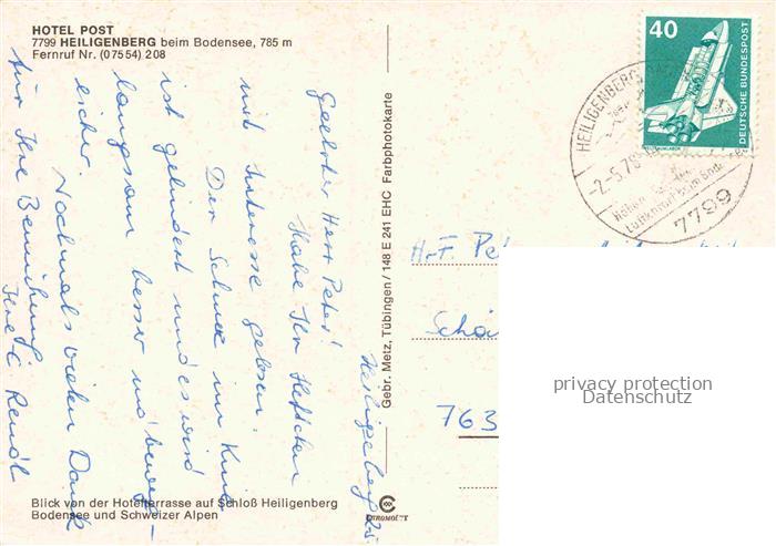 74104290 alte Postkarte Heiligenberg Baden Hotel Post Blick von der Hotelterrasse auf Schloss Heiligenberg Bodensee und Schweizer Alpen postalisch gelaufen Erhaltung siehe scans [FriedD77] KatCode: 11110008435020