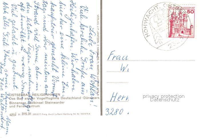73668661 alte Postkarte Heiligenhafen Ostseebad Binnensee Halbinsel Steinwarder Ferienzentrum Das Bad an der Vogelfluglinie Deutschland Daenemark Fliegeraufnahme postalisch gelaufen Erhaltung siehe scans [FriedD77] KatCode: 11110001055021