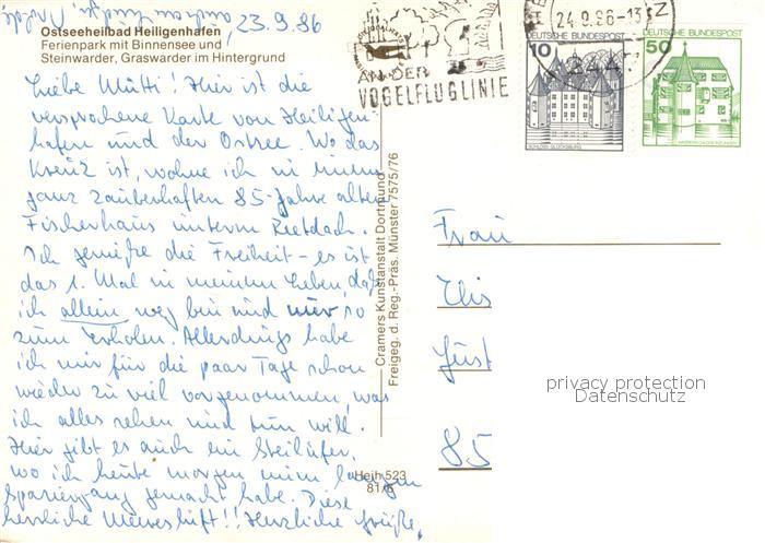 73779338 alte Postkarte Heiligenhafen Ostseebad Ferienpark mit Binnensee und Steinwarder Graswarder Fliegeraufnahme postalisch gelaufen Erhaltung siehe scans [WerneD78] KatCode: 11110001055021