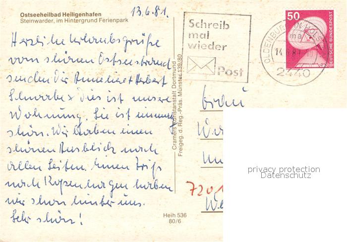 73744792 alte Postkarte Heiligenhafen Ostseebad Steinwarder mit Ferienpark Fliegeraufnahme postalisch gelaufen Erhaltung siehe scans [FriedD77] KatCode: 11110001055021