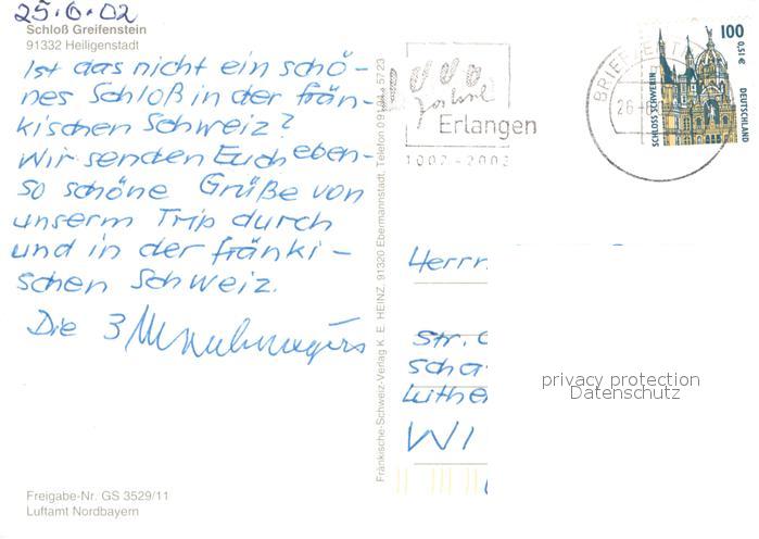 73723689 alte Postkarte Heiligenstadt Oberfranken Schloss Greifenstein Fliegeraufnahme postalisch gelaufen Erhaltung siehe scans [WerneD78] KatCode: 11110009471142