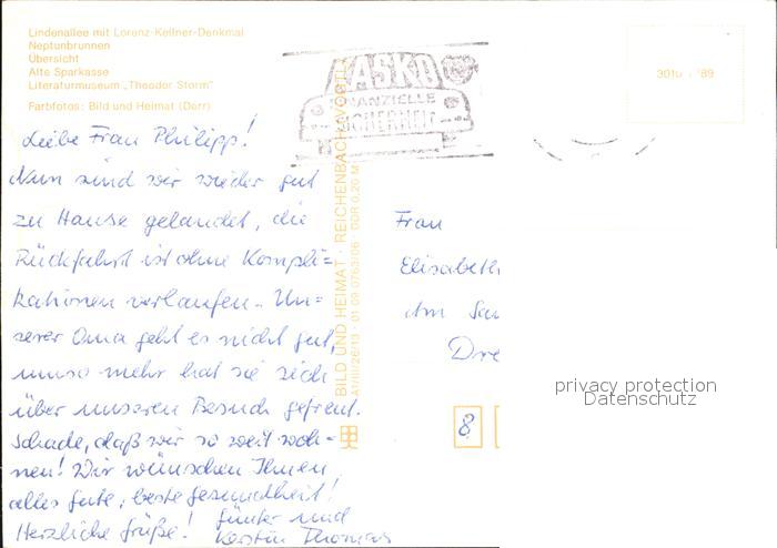 72423011 alte Postkarte Heiligenstein Bad Lorenz-Kellner Denkmal Neptunbrunnen Literaturmuseum Theodor Storm postalisch gelaufen Erhaltung siehe scans KatCode: 11110016063066