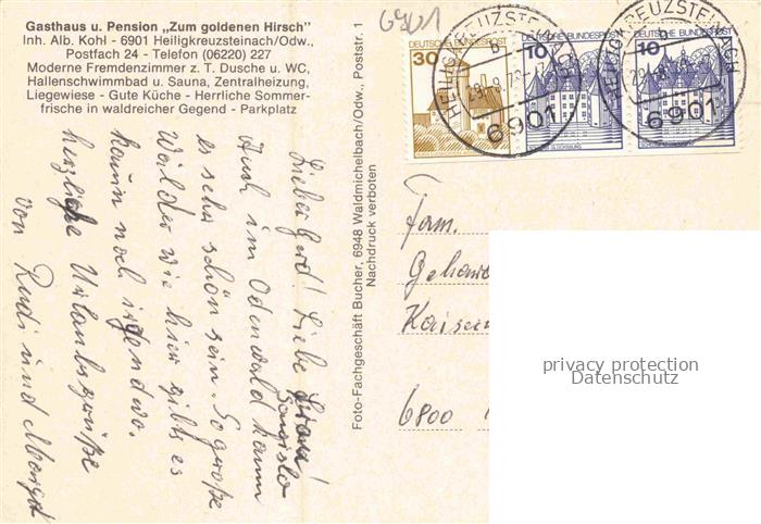 74048550 alte Postkarte Heiligkreuzsteinach Heidelberg BW Gasthaus Zum goldenen Hirsch Panorama postalisch gelaufen Erhaltung siehe scans [WerneD78] KatCode: 11110008226029
