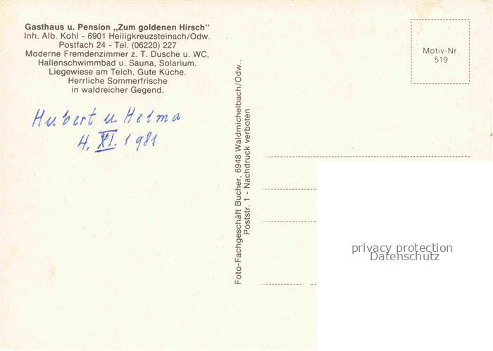 74048454 Heiligkreuzsteinach Heidelberg BW Ortsansicht Gasthaus Pension Zum goldenen Hirsch Restaurant Hallenbad postalisch nicht gelaufen Erhaltung siehe scans [FriedD77] KatCode: 11110008226029