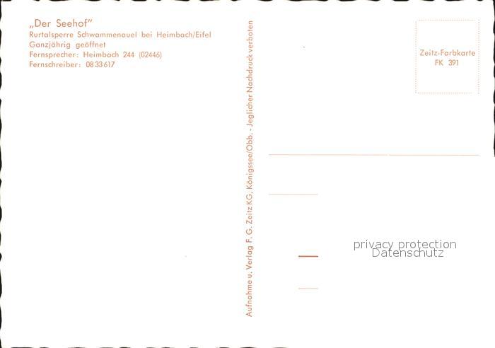 72420901 Heimbach Eifel Der Seehof Rurtalsperre Schwammenauel postalisch nicht gelaufen Erhaltung siehe scans KatCode: 11110005358012