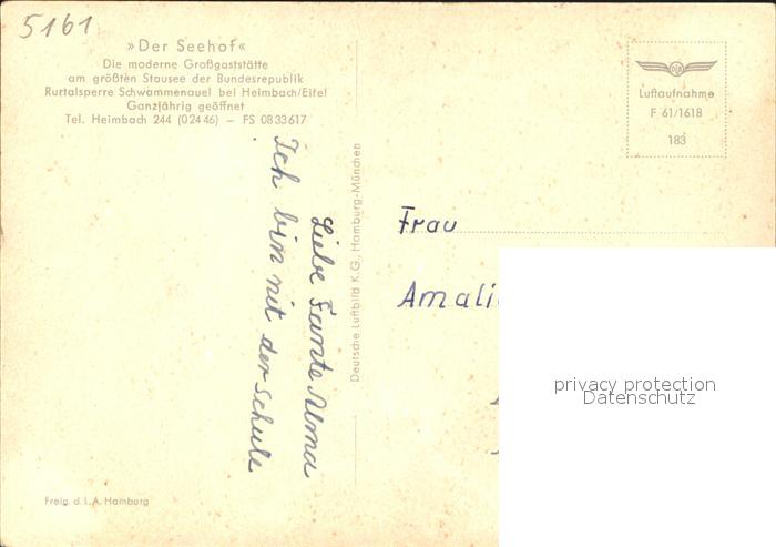 71947351 Heimbach Eifel Gaststaette Der Seehof Stausee Rurtalsperre Schwammenauel Fliegeraufnahme postalisch nicht gelaufen Erhaltung siehe scans KatCode: 11110005358012