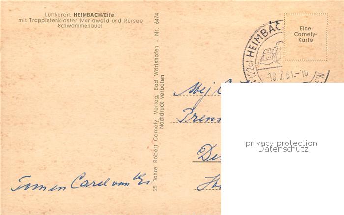 73141851 alte Postkarte Heimbach Eifel Gesamtansicht Burg Schwimmbad Mariawald Stausee Rursee Schwammenauel Fliegeraufnahme postalisch gelaufen Erhaltung siehe scans [FriedD77] KatCode: 11110005358012