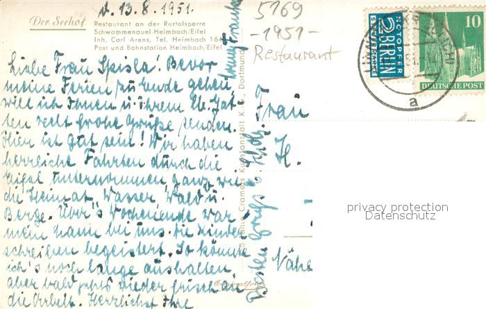 73691505 alte Postkarte Heimbach Eifel Restaurant an der Rurtalsperre Schwammenauel Terrassen im Seehof postalisch gelaufen Erhaltung siehe scans [FriedD77] KatCode: 11110005358012