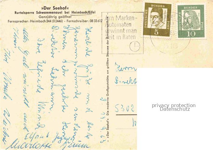 34145147 alte Postkarte Heimbach Eifel Rur Dueren NRW Der Seehof Rurtalsperre Schwammenauel postalisch gelaufen Erhaltung siehe scans [WerneD78] KatCode: 11110005358012