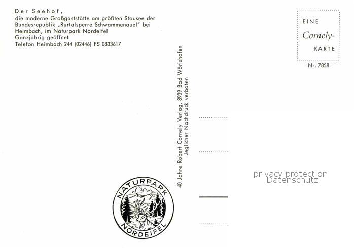 72698045 Heimbach Eifel Seehof Gaststaette Segelboote Rurtalsperre postalisch nicht gelaufen Erhaltung siehe scans [KathaD79] KatCode: 11110005358012