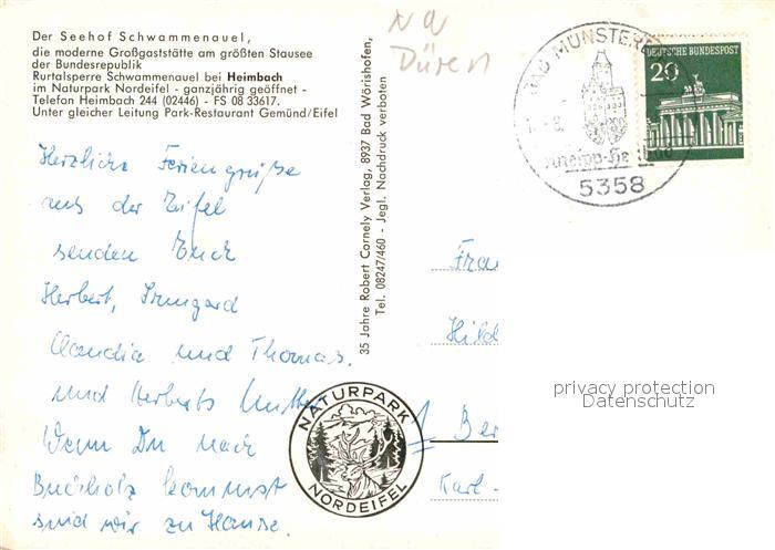 72919347 alte Postkarte Heimbach Eifel Seehof Schwammenauel postalisch gelaufen Erhaltung siehe scans [NatalD47] KatCode: 11110005358012