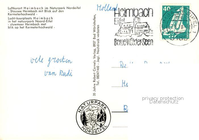 73308265 alte Postkarte Heimbach Eifel Stausee mit Kermeterhochwald postalisch gelaufen Erhaltung siehe scans [WerneD78] KatCode: 11110005358012