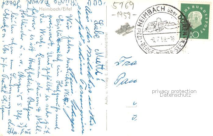 73691742 alte Postkarte Heimbach Eifel Uferpartie an der Rur Bruecke Ruine Burg Hengebach postalisch gelaufen Erhaltung siehe scans [FriedD77] KatCode: 11110005358012